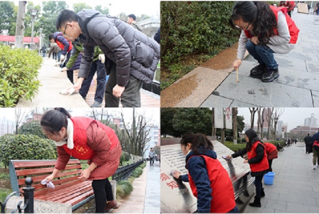 下午,活動參與人員統(tǒng)一志愿者服裝著裝,集體前往武昌首義廣場。根據(jù)安排,志愿者們分成若干小組,拿出提前準(zhǔn)備好的清潔工具迅速投入到廣場的清潔中。桌椅清潔、地面打掃、垃圾分類、擺正路標(biāo),大家分工合作,干勁十足,不放過任何死角,對廣場周邊公共設(shè)施進行了全面清潔,給游客及周邊居民提供一個良好的廣場環(huán)境。